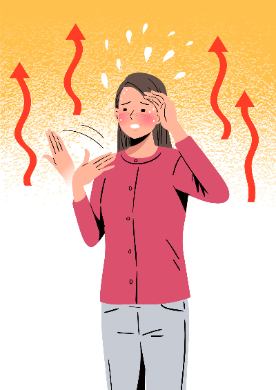 붉어지는 얼굴 외에 화끈거리며 갑자기 열감이 오르거나 땀이 나는 경우가 있습니다. 나도 모르게 덥거나, 감정의 변화가 심하지 않아도 불쑥 붉어지고 땀이 쭉 나게 되는 상황의 빈도가 높아집니다.