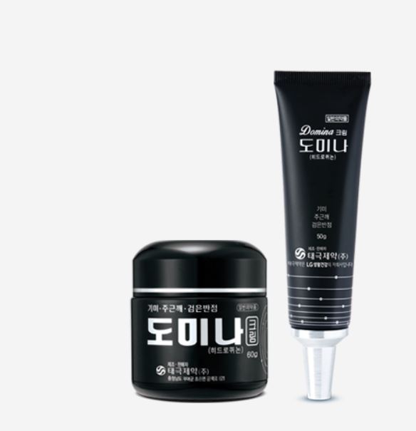 검정색 통에 든 동글한 도미나 크림으로 1세대 기미크림이 아닐까 싶어요. 기미 치료를 위한 크림으로 오래전부터 유명세를 탄 제품이고 현재도 판매량이 매우 많고 효과도 보고 있는 제품입니다. 하이드로퀴논은 4% 포함하고 있습니다. 태극제약에서 출시한 제품입니다.