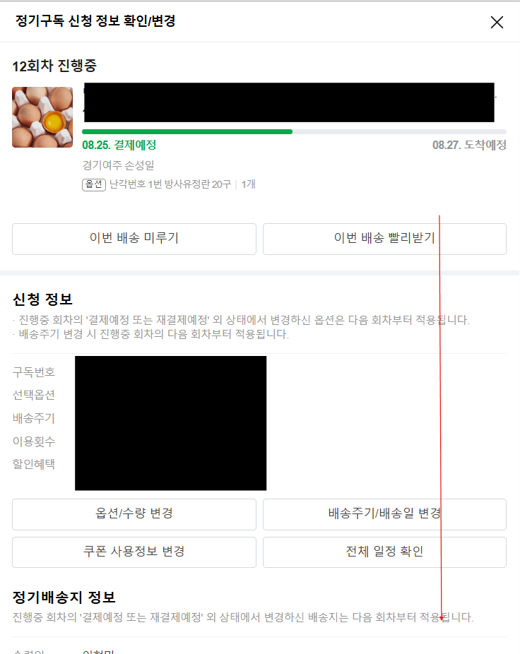 정기구독 메뉴에는 제가 그간 구독하는 상품들과 금액, 주기 등이 나오는데요. 이미 샐러드는 구독을 해지한 상태라 구독 중인 계란을 가지고 진행해 볼게요. 오른쪽 하단에 [진청 정보 확인/변경]으로 들어가 줍니다.