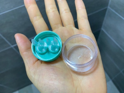 - 대략 헹궈빈 뚜껑에서 렌즈를 꺼내 식염수로 다시 세척 후 본래의 렌즈 케이스에 넣어 보관합니다. (보존액 필수)