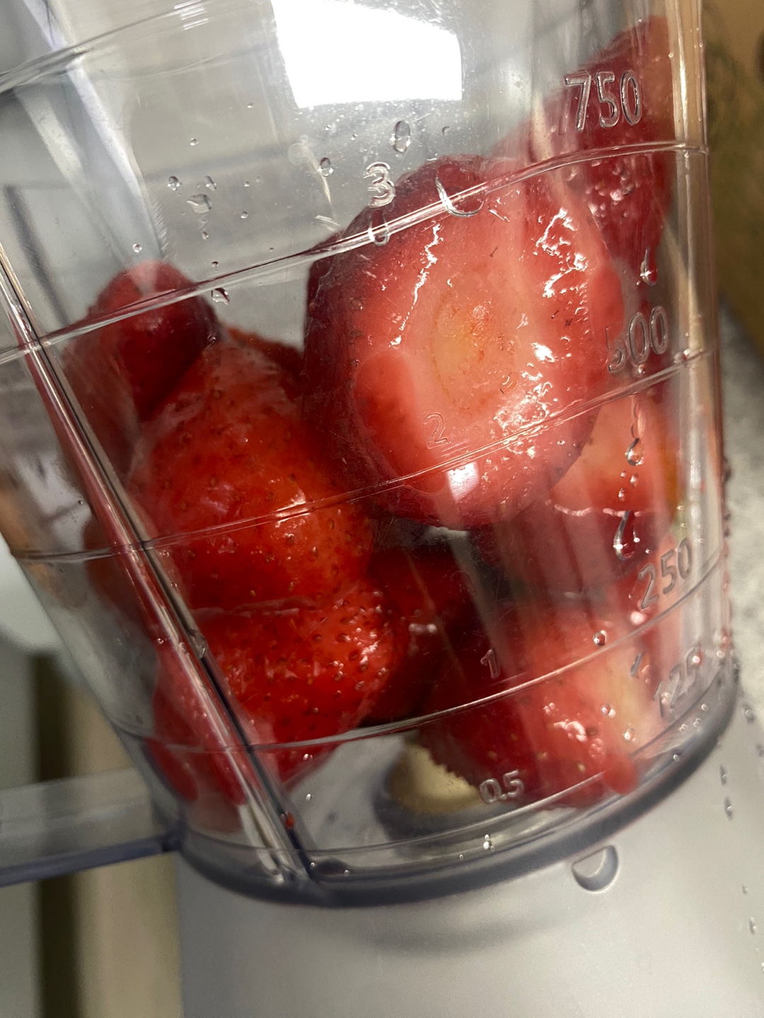- 믹서기에 딸기를 넣고 농도에 맞는 물을 추가합니다.