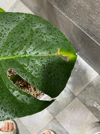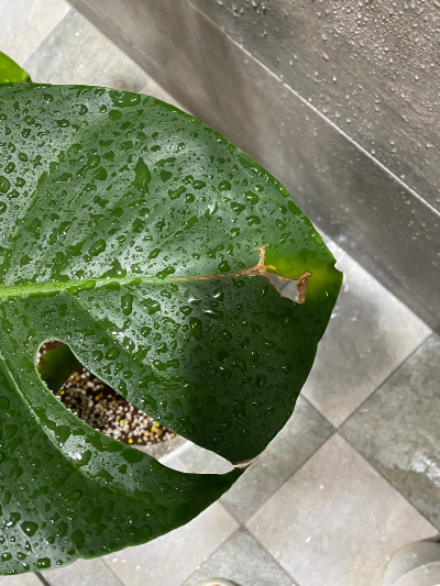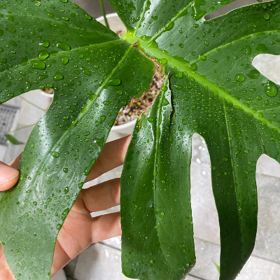 자연스러운 현상이 아닌 인위적인 손상으로 인해 찢어진 몬스테라 잎.