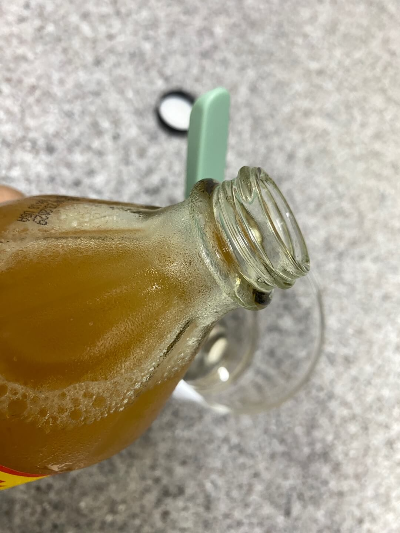 제가 산 브래그 제품을 받아보니 병에 사과쥬스같은 것이 담겨있네요. 맨 밑에는 약간의 침전물이 있어 쉐킷쉐킷 흔들어주었습니다. 겉으로 보기엔 참 달콤한 사과주스 맛이 나야하는데 ... 열어보니 음....??