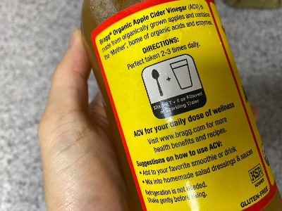 병에 비니거라고 적혀있는데 이건 비건제품이라는 뜻이지 브랜드가 아니니 오해하지 마세요. 제가 산 제품은 브래그(Bragg) 라는 브랜드로 애플사이다식초의 대표 브랜드, 가장 유명한 브랜드를 구매했습니다.