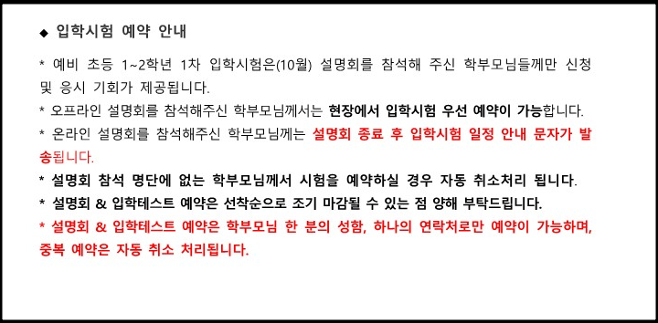현장 설명회의 경우 현장에서 바로 입학테스트 신청을 할 수 있고 온라인은 설명회 종료 후 안내 문자가 발송됩니다. 그런데 대부분 테스트 신청은 거의 통과하시는 것 같았어요. 물론 시간 땡! 하고 들어가셔야 하긴 하고요. 테스트 대상은 정원의 5 배수를 뽑는다는 말도 있기도 하지만 정확한 경쟁률은 모르겠네요.