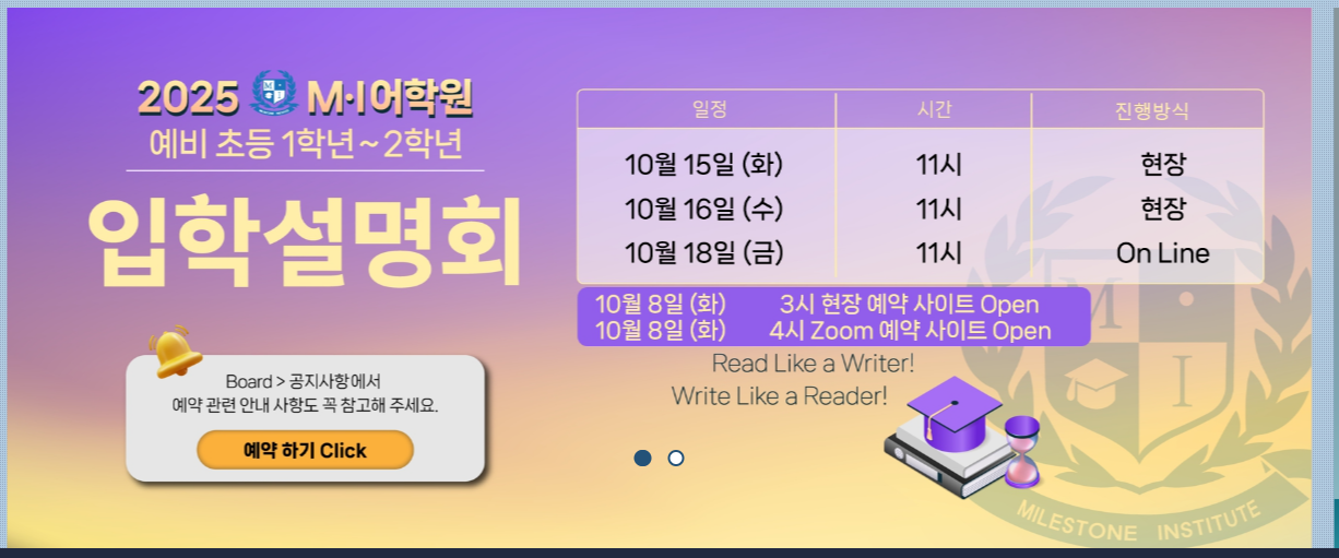 현재 10월 초인 데요, 아직 새 학기 준비를 하기에는 이른 시기이지만 내년 입학하는 예비초를 대상으로 입학설명회가 진행되고 있어요. (대부분의 어학원들 입학설명회는 10월 안에 종료가 됩니다) 겨울쯤 돼서 우리 아이 어디 보내지? 하시면 늦는다는 점 꼭 기억하셔야 해요.