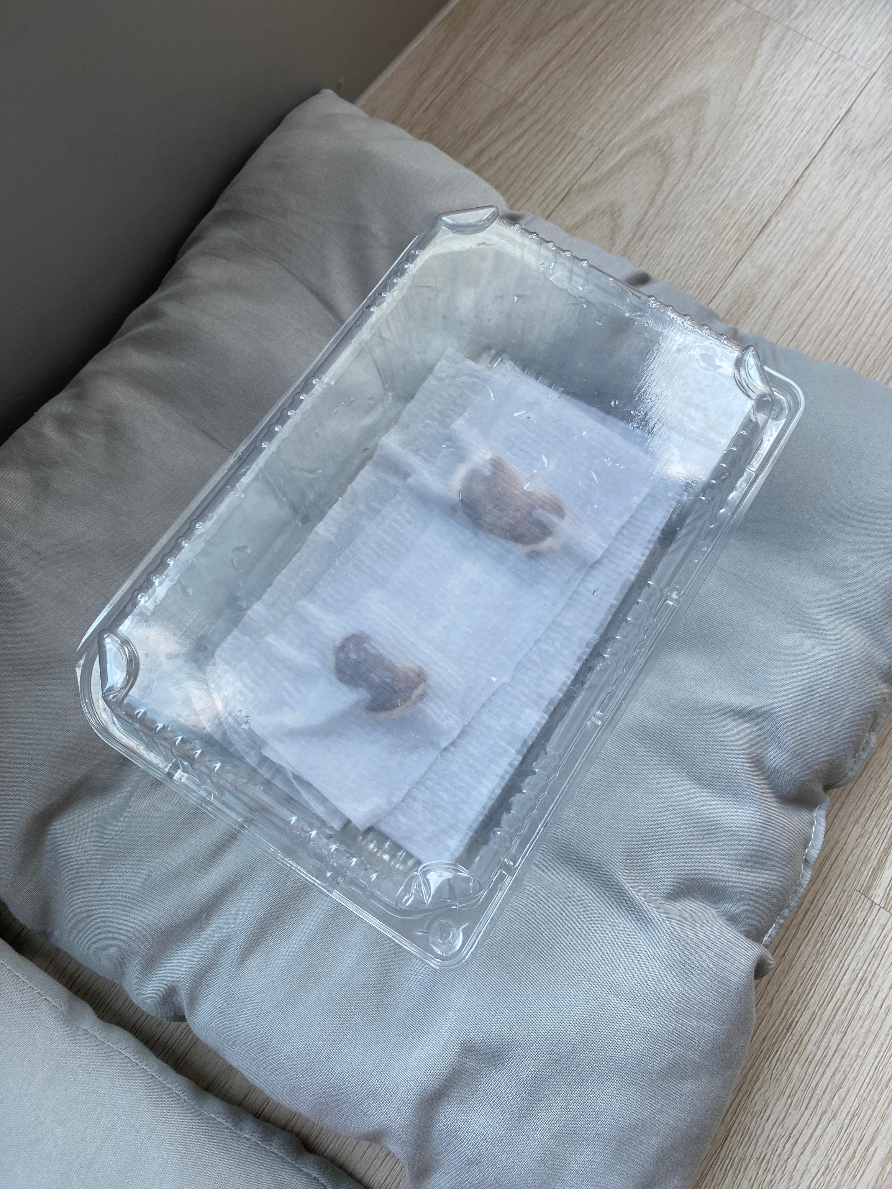 주의할 점은 물을 너무 많이 넣지 말고 밑에만 살짝 깔리도록 넣어주셔야 합니다. 휴지도 너무 많이 깔면 곰팡이가 생길 수 있다고 하니 한 장을 반으로 접어 만들어주시면 됩니다.