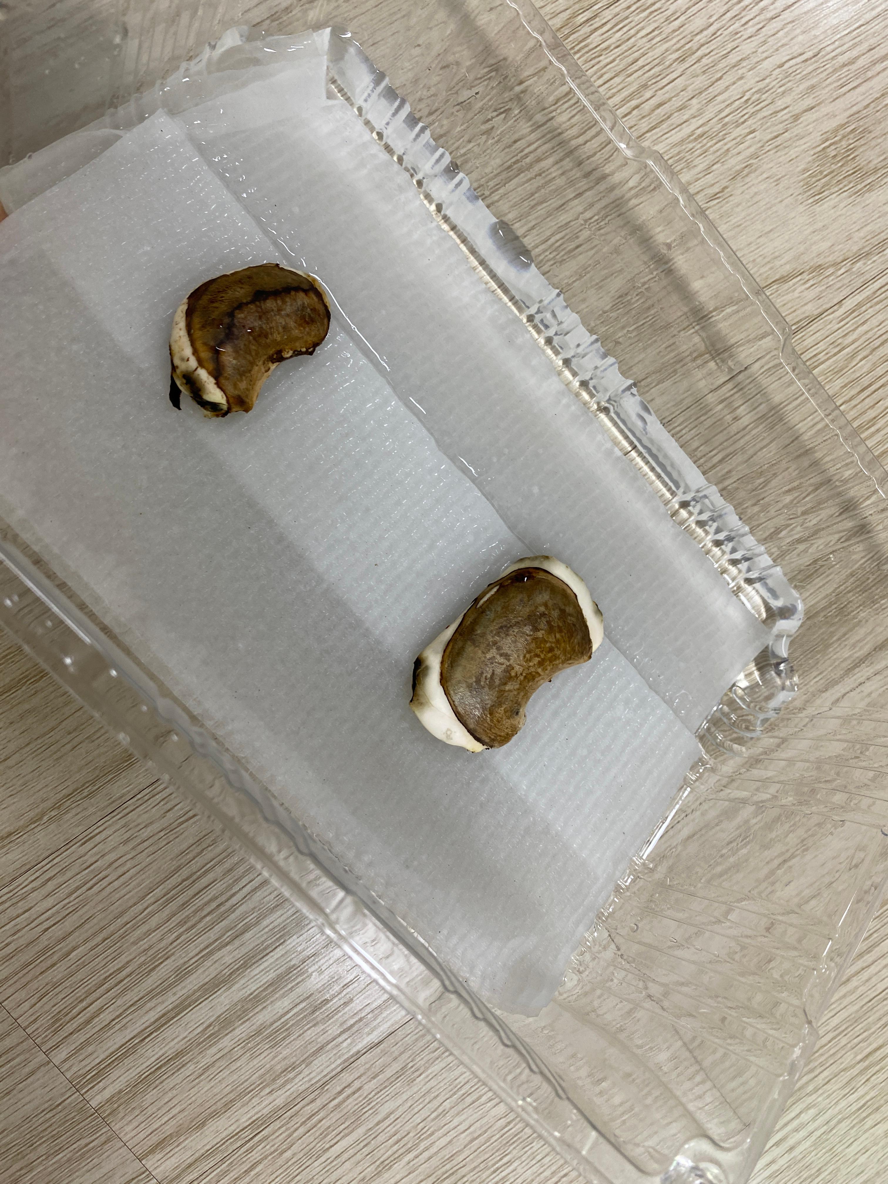 이제 빈통을 활용합니다. 자꾸만 뚜껑이 덮여 방해가 되길래 가위로 먼저 뚜껑을 떼어주었습니다. 키친타올 한 장을 깔고 물을 자박하게 촉촉하게 살짝만 부어주고 두 개의 씨앗을 살포시 올려주었습니다. 딱 봐도 아래 씨앗이 힘이 센 씨앗 같아 보였어요. 둘 다 성공적으로 발아가 되기를...