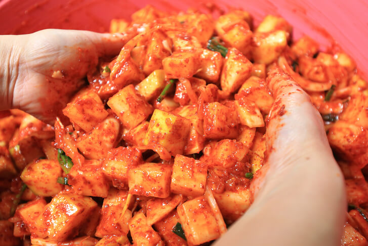 - 절여진 콜라비에 고추가루, 새우젓 (또는 멸치액젓), 간마늘, 생강즙과 쫑쫑 썰어둔 대파를 넣어 버무려줍니다.